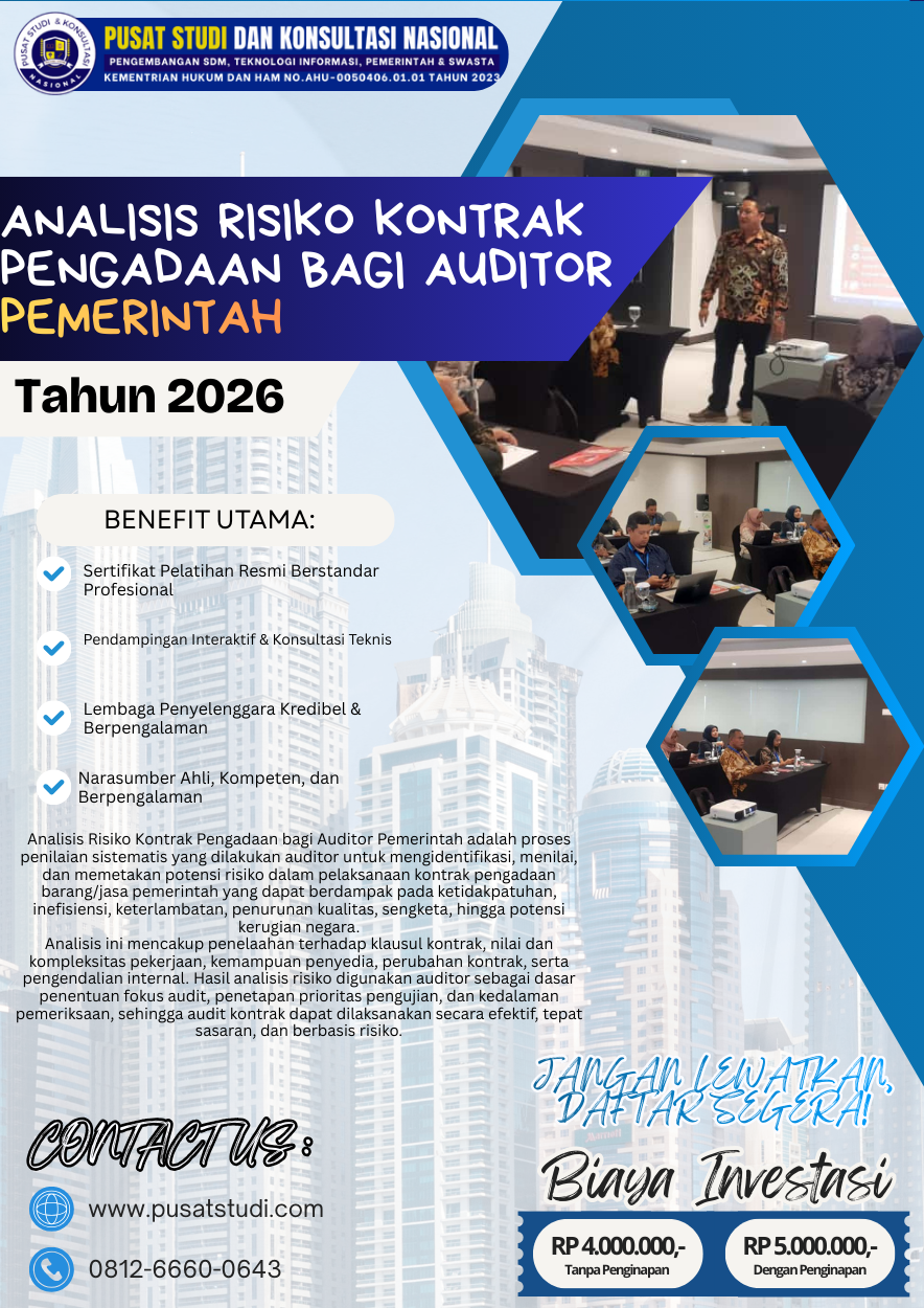 Analisis risiko kontrak pengadaan merupakan kompetensi inti yang harus dimiliki auditor pemerintah dalam menjalankan fungsi pengawasan yang efektif dan berintegritas. Dengan pendekatan yang sistematis, berbasis kontrak, dan didukung bukti yang kuat, auditor dapat memberikan nilai tambah nyata bagi tata kelola pengadaan publik.