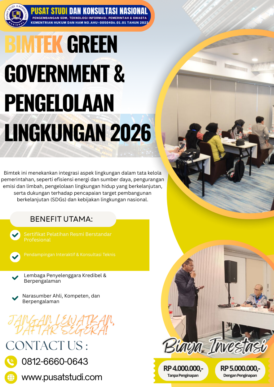 Wujudkan tata kelola pemerintahan yang berkelanjutan, bertanggung jawab, dan berorientasi masa depan melalui peningkatan kapasitas aparatur dalam Bimtek Green Government & Pengelolaan Lingkungan 2026 bersama lembaga pelatihan terpercaya.