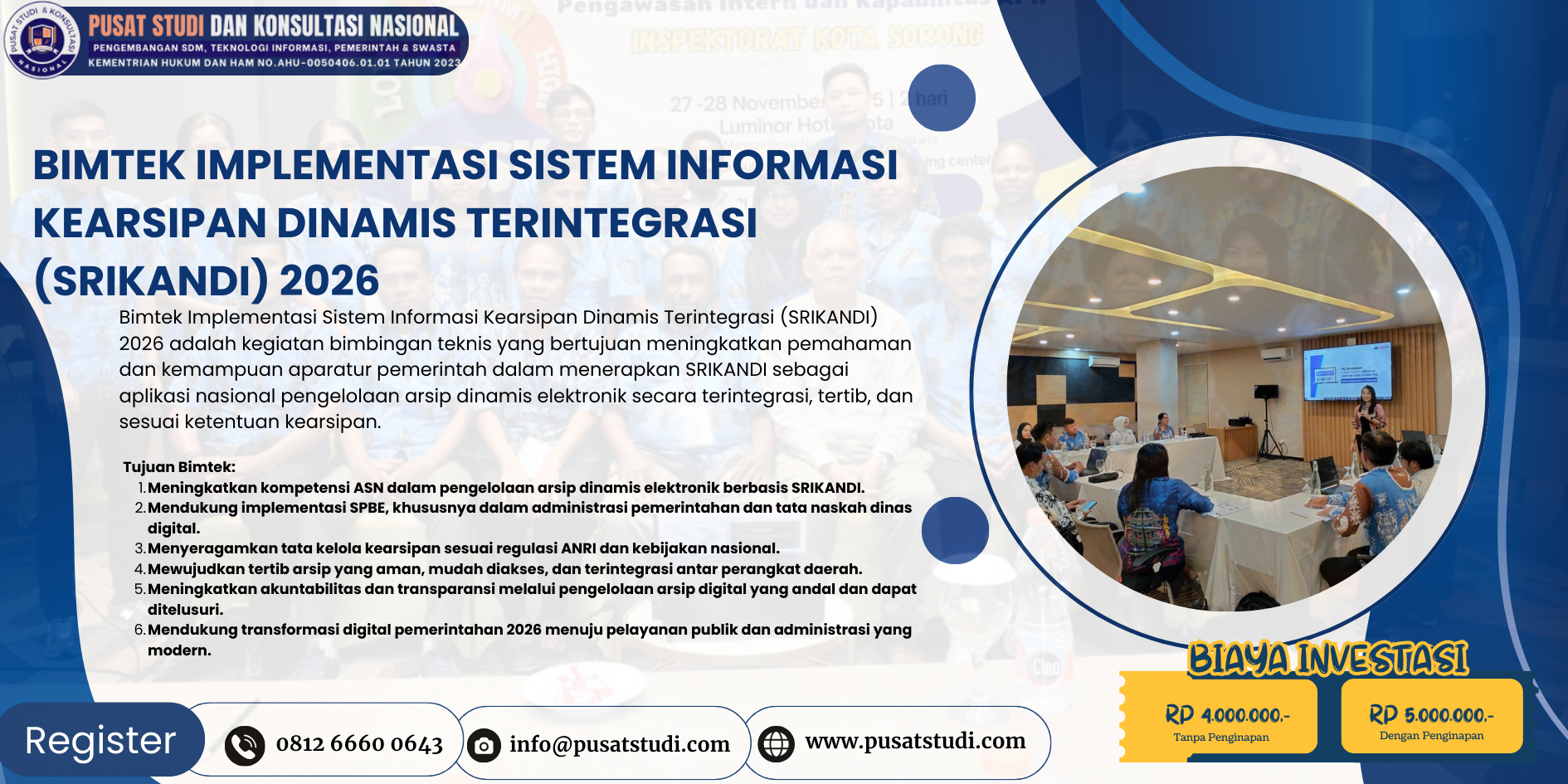 Memasuki tahun 2026, implementasi SRIKANDI menjadi semakin strategis seiring penguatan Sistem Pemerintahan Berbasis Elektronik (SPBE). Bimtek Implementasi Sistem Informasi Kearsipan Dinamis Terintegrasi (SRIKANDI) 2026 hadir untuk meningkatkan kapasitas aparatur pemerintah pusat dan daerah agar mampu mengelola arsip dinamis secara tertib, aman, dan terintegrasi.