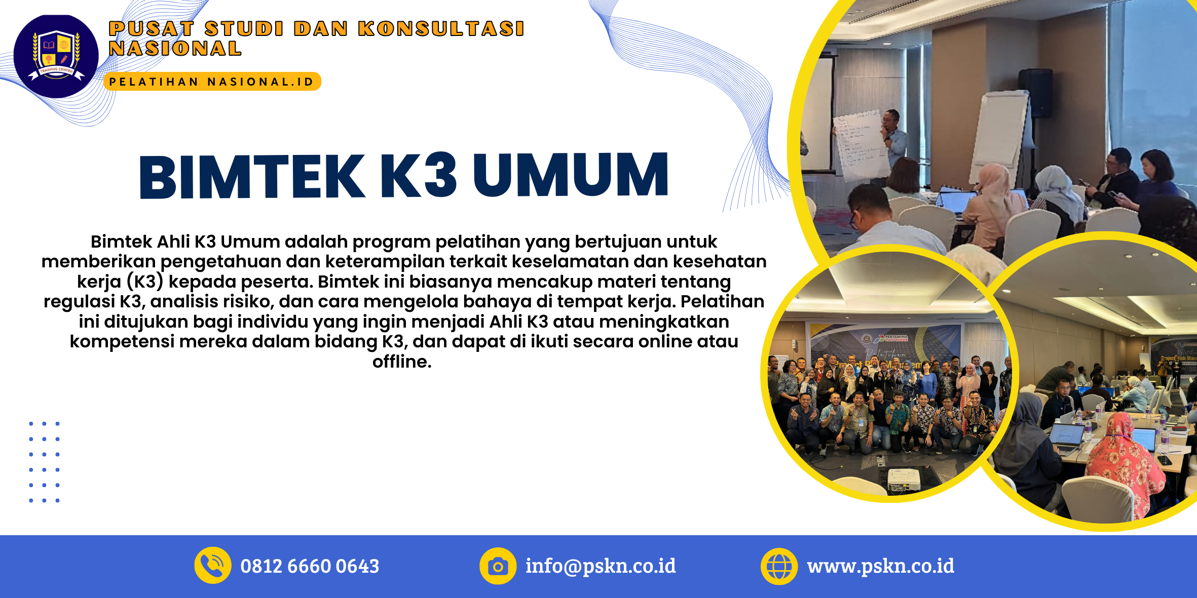 Bimtek Ahli K3 Umum adalah program pelatihan yang bertujuan untuk memberikan pengetahuan dan keterampilan terkait keselamatan dan kesehatan kerja (K3) kepada peserta. Bimtek ini biasanya mencakup materi tentang regulasi K3, analisis risiko, dan cara mengelola bahaya di tempat kerja. Pelatihan ini ditujukan bagi individu yang ingin menjadi Ahli K3 atau meningkatkan kompetensi mereka dalam bidang K3, dan dapat di ikuti secara online atau offline.