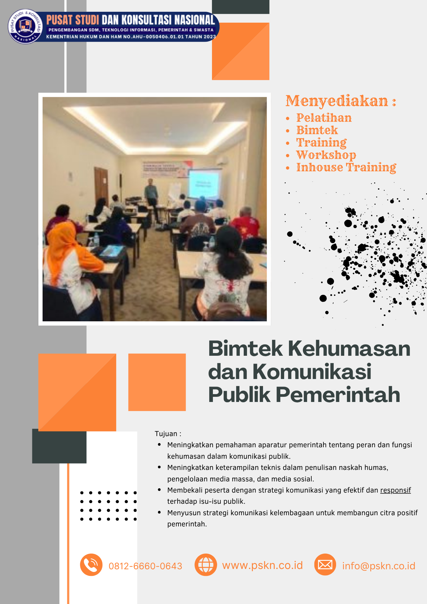 Dengan Ini Kami Pusat Studi Konsultasi Nasional Mengundangan Bapak/Ibu Untuk Hadir dalam Bimbingan Teknis Dengan Tema ‘‘Bimtek Kehumasan dan Komunikasi Publik Pemerintah”