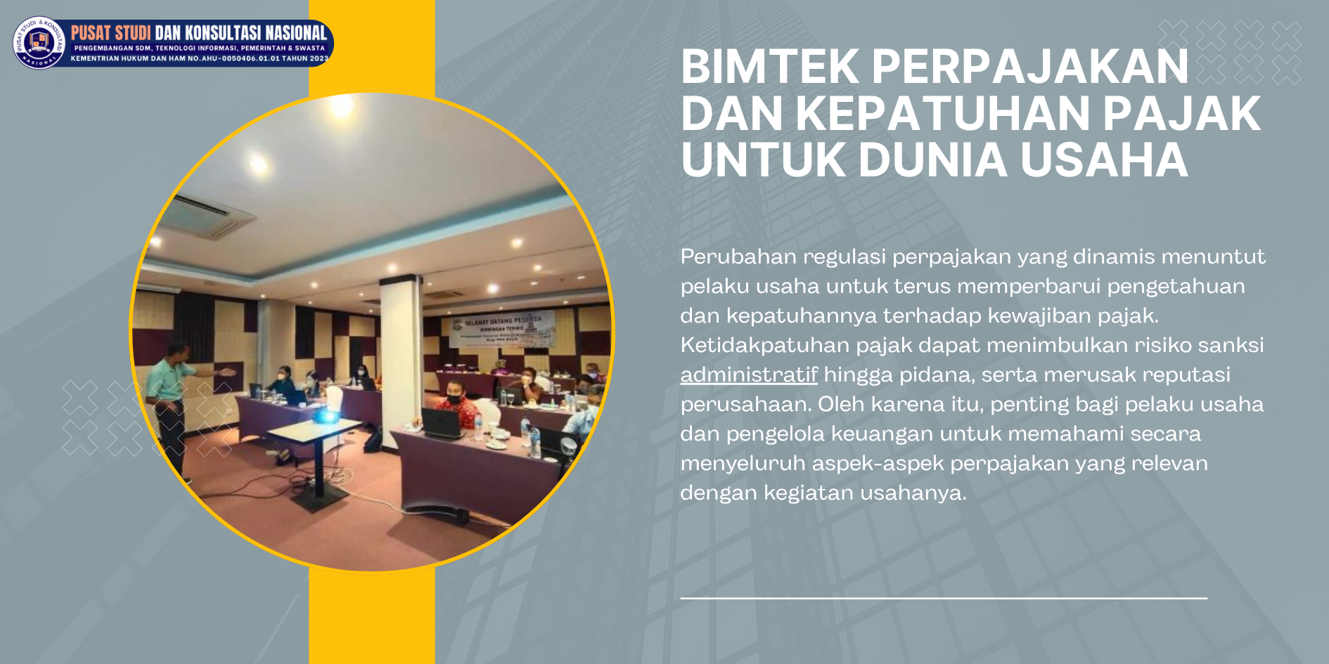 Dengan Ini Kami Pusat Studi Konsultasi Nasional Mengundangan Bapak/Ibu Untuk Hadir dalam Bimbingan Teknis Dengan Tema ‘‘Bimtek Perpajakan dan Kepatuhan Pajak untuk Dunia Usaha”