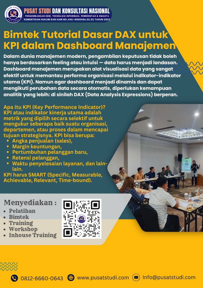 Mari bangun dashboard manajemen yang dinamis, responsif, dan bermakna dengan dasar-dasar DAX dan KPI. Untuk pendalaman lebih komprehensif, ikuti Training Integrasi Data Excel, Power BI, dan PowerPoint untuk Dashboard Manajemen agar hasil dashboard Anda tidak hanya kuat dari sisi analitik tetapi juga siap disajikan ke pemangku kebijakan.