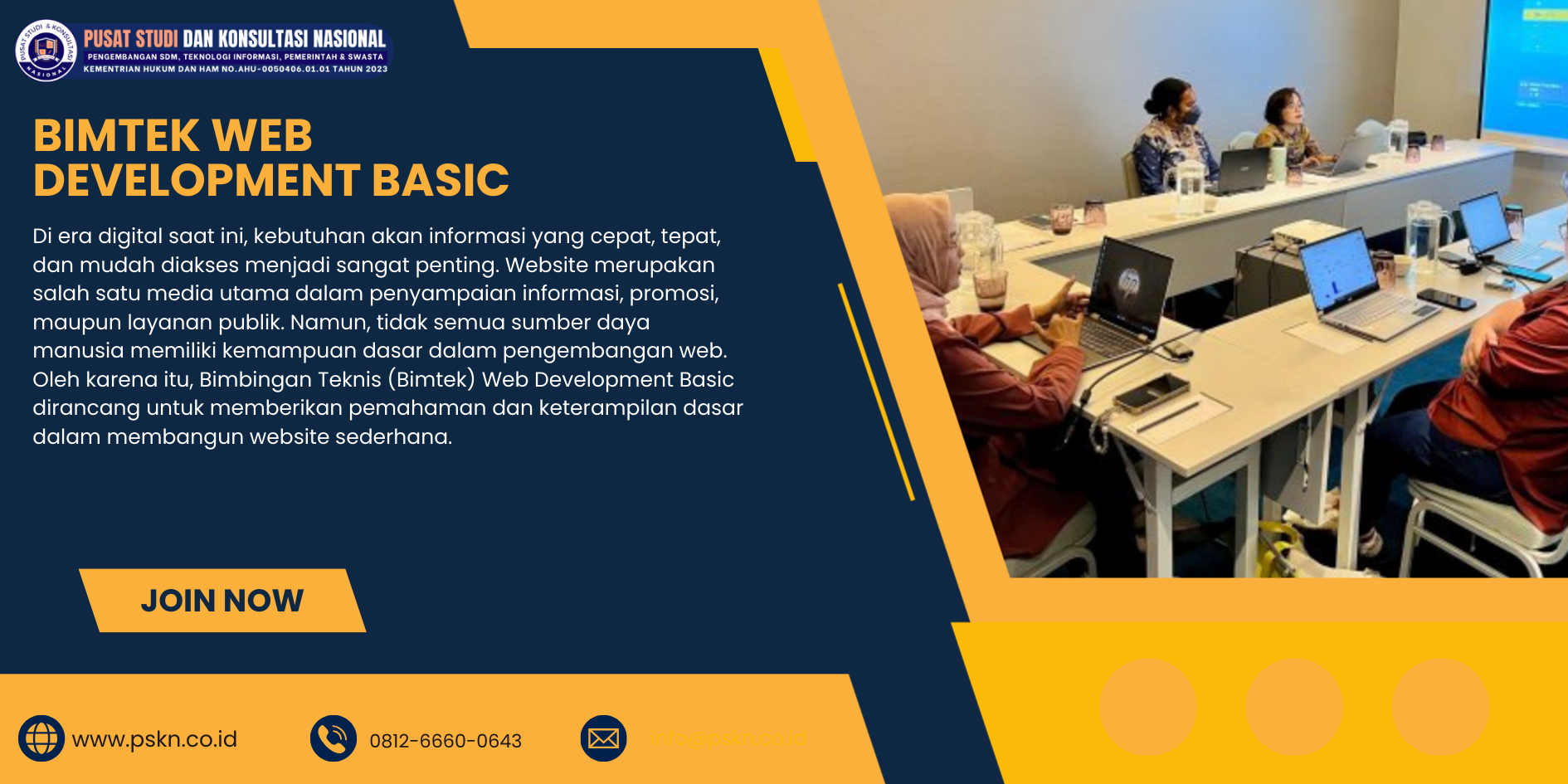 Di era digital saat ini, kebutuhan akan informasi yang cepat, tepat, dan mudah diakses menjadi sangat penting. Website merupakan salah satu media utama dalam penyampaian informasi, promosi, maupun layanan publik. Namun, tidak semua sumber daya manusia memiliki kemampuan dasar dalam pengembangan web. Oleh karena itu, Bimbingan Teknis (Bimtek) Web Development Basic dirancang untuk memberikan pemahaman dan keterampilan dasar dalam membangun website sederhana.