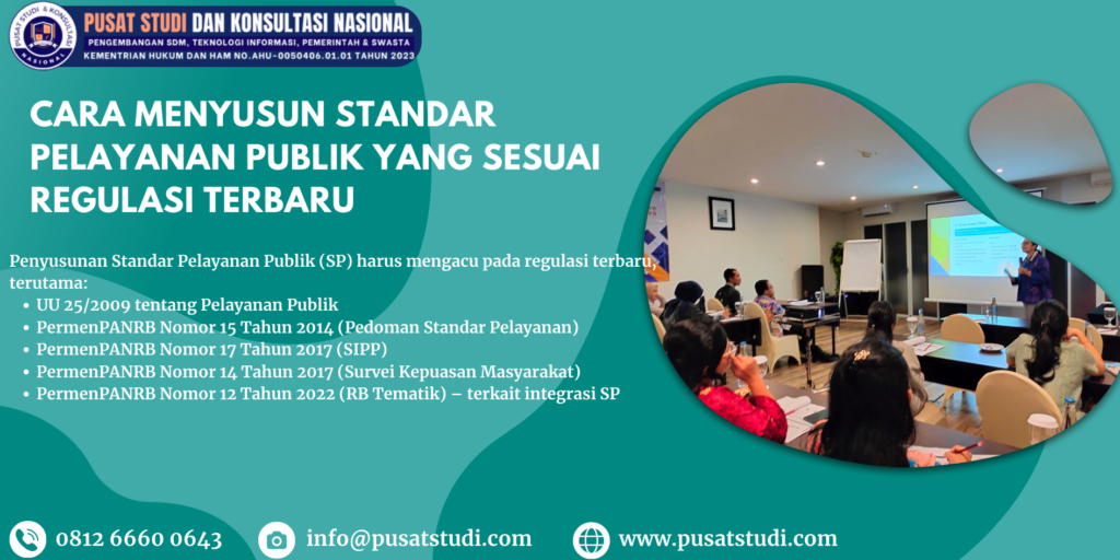 • PermenPANRB tentang Pedoman Penyusunan Standar Pelayanan (regulasi terbaru dapat dilihat pada situs resmi MenPANRB di bagian Pelayanan Publik)