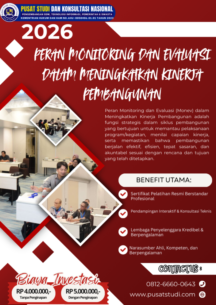 Monitoring dan evaluasi (Monev) merupakan instrumen strategis dalam siklus pembangunan yang berfungsi memastikan bahwa perencanaan, pelaksanaan, dan h...