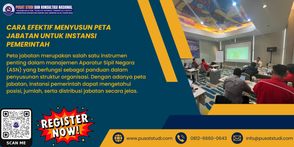 Peta jabatan merupakan salah satu instrumen penting dalam manajemen Aparatur Sipil Negara (ASN) yang berfungsi sebagai panduan dalam penyusunan strukt...