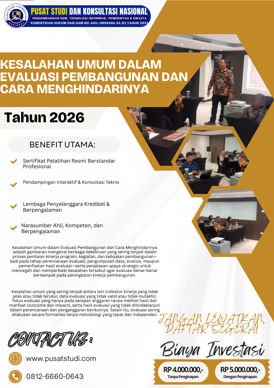 Perkuat pemahaman dan praktik evaluasi pembangunan agar setiap kebijakan dan program memberikan dampak nyata melalui peningkatan kapasitas perencanaan dan evaluasi dalam Bimtek Perencanaan & Evaluasi Pembangunan 2026.