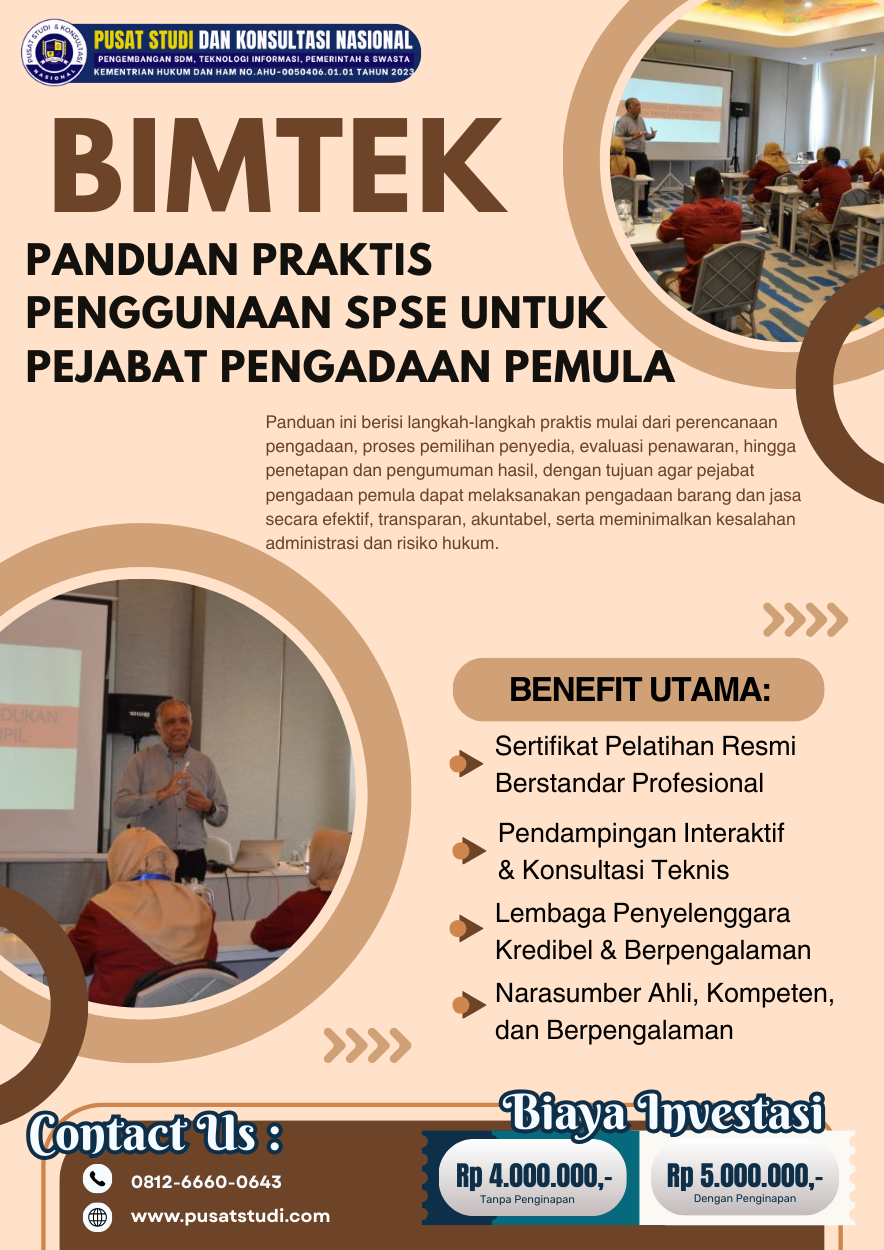Artikel ini disusun sebagai panduan praktis yang membahas dasar-dasar SPSE, tahapan penggunaan, kesalahan yang sering terjadi, serta tips penting bagi pejabat pengadaan pemula. Pembahasan ini melengkapi pemahaman komprehensif yang terdapat dalam Bimtek E-Catalogue & SPSE: Panduan Lengkap Pengadaan Barang dan Jasa Pemerintah yang Transparan dan Akuntabel.