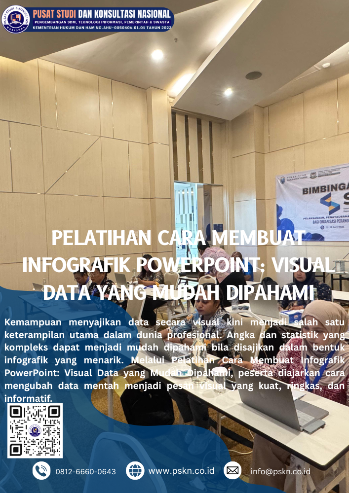 Kemampuan menyajikan data secara visual kini menjadi salah satu keterampilan utama dalam dunia profesional. Angka dan statistik yang kompleks dapat menjadi mudah dipahami bila disajikan dalam bentuk infografik yang menarik. Melalui Pelatihan Cara Membuat Infografik PowerPoint: Visual Data yang Mudah Dipahami, peserta diajarkan cara mengubah data mentah menjadi pesan visual yang kuat, ringkas, dan informatif.