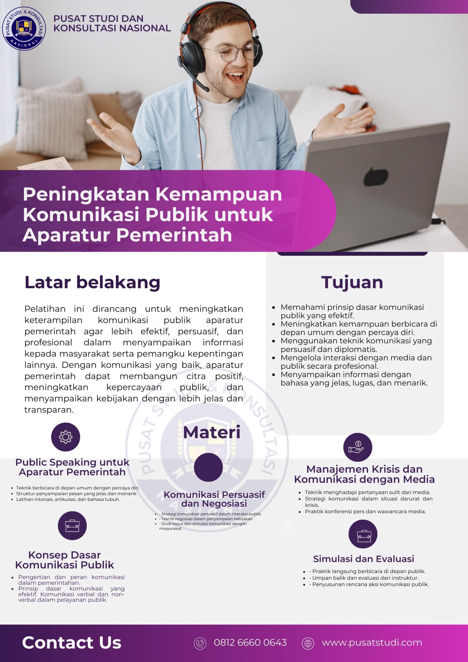 Pelatihan Peningkatan Kemampuan Komunikasi Publik untuk Aparatur Pemerintah 2025  agar lebih efektif, persuasif, dan profesional dalam menyampaikan informasi kepada masyarakat serta pemangku kepentingan lainnya. Dengan komunikasi yang baik, aparatur pemerintah dapat membangun citra positif, meningkatkan kepercayaan publik, dan menyampaikan kebijakan dengan lebih jelas dan transparan.