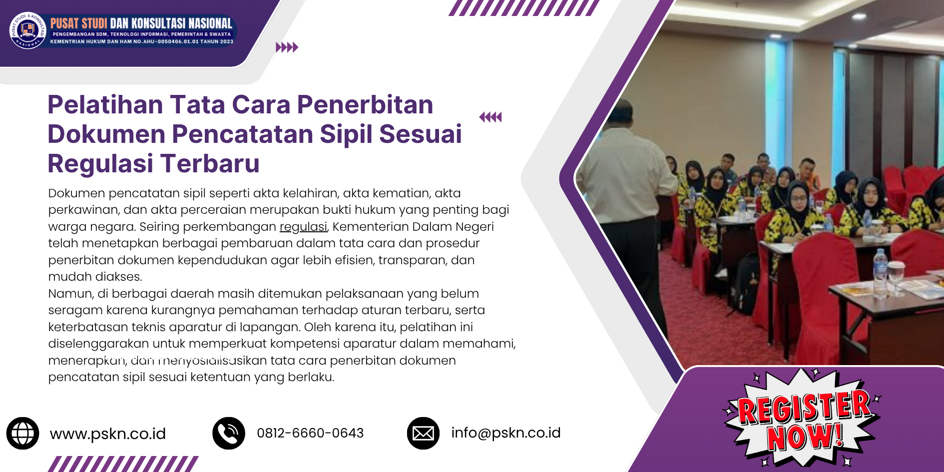 Dengan Ini Kami Pusat Studi Konsultasi Nasional Mengundangan Bapak/Ibu Untuk Hadir dalam Bimbingan Teknis Dengan Tema ‘‘Pelatihan Tata Cara Penerbitan Dokumen Pencatatan Sipil Sesuai Regulasi Terbaru”