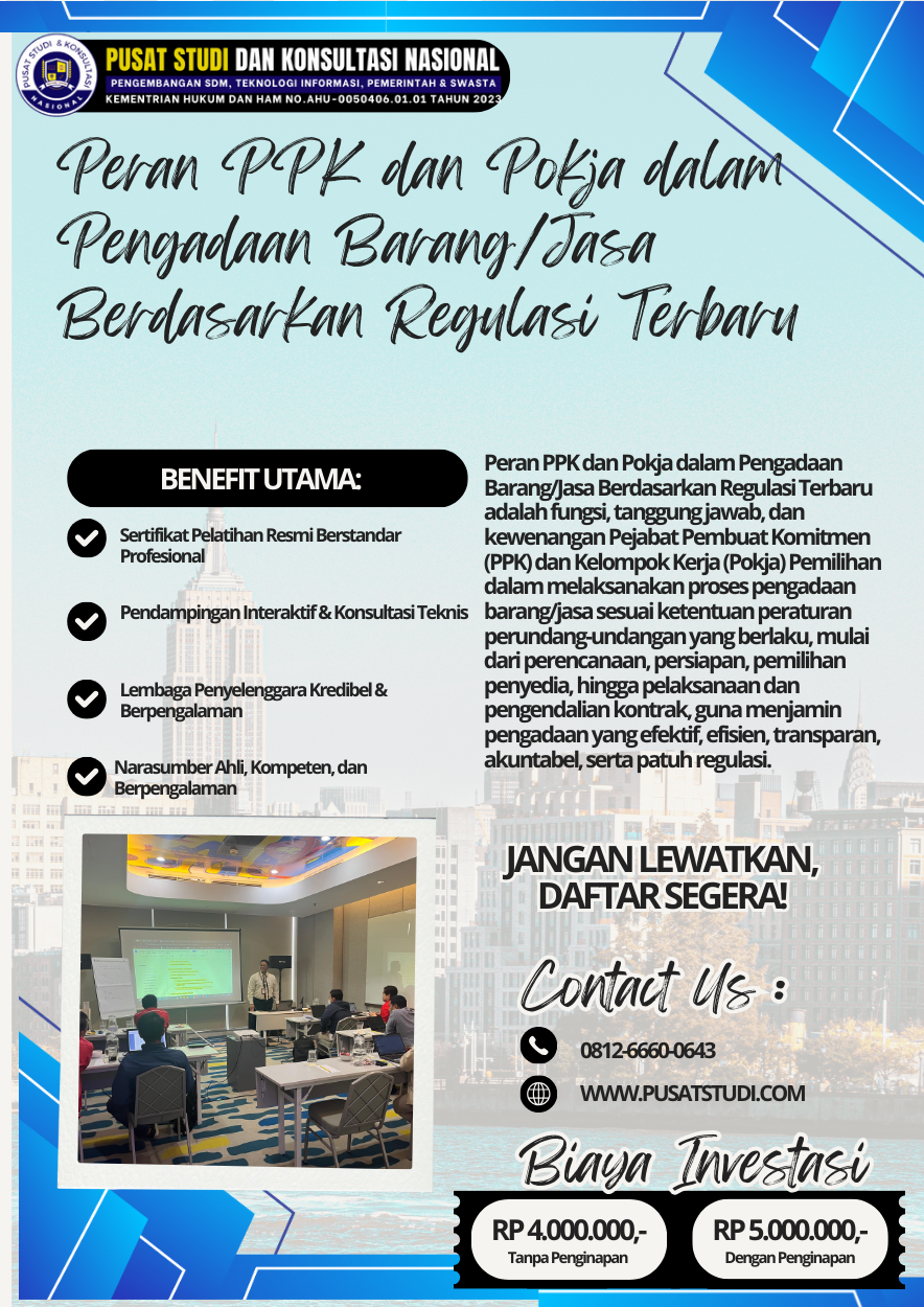 Tingkatkan pemahaman peran PPK dan Pokja, perkuat koordinasi pengadaan, dan wujudkan proses pengadaan barang/jasa yang profesional, patuh regulasi, serta bernilai manfaat melalui penguatan kapasitas dan pembelajaran strategis dalam Bimtek Penerapan Peraturan Presiden No. 46 Tahun 2025 dalam Pengadaan Barang/Jasa 2026