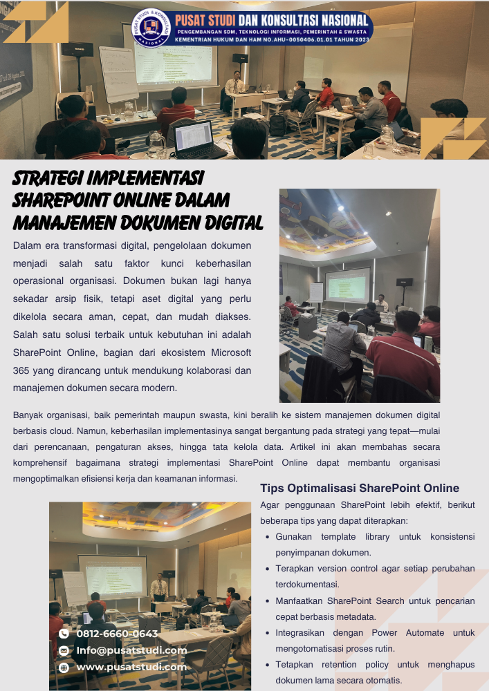 Implementasi SharePoint Online dalam manajemen dokumen digital merupakan langkah strategis menuju efisiensi, keamanan, dan kolaborasi yang lebih baik di lingkungan kerja modern. Dengan perencanaan matang, pelatihan yang tepat, serta dukungan manajemen, SharePoint dapat menjadi fondasi utama dalam transformasi digital organisasi Anda.