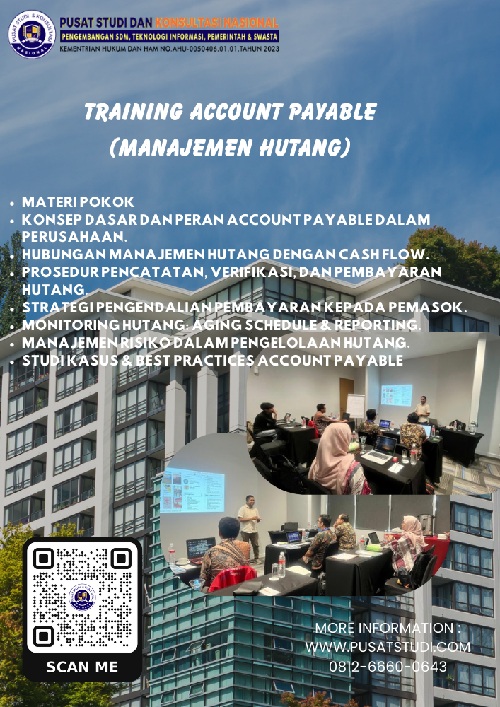 Pusat Studi dan Konsultasi Nasional (PSKN) mengundang Bapak/Ibu untuk mengikuti Bimtek bertema ”Training Account Payable (Manajemen Hutang)”, sebuah program strategis yang dirancang untuk mendukung peningkatan kompetensi, profesionalisme, dan efektivitas kerja di instansi/organisasi.