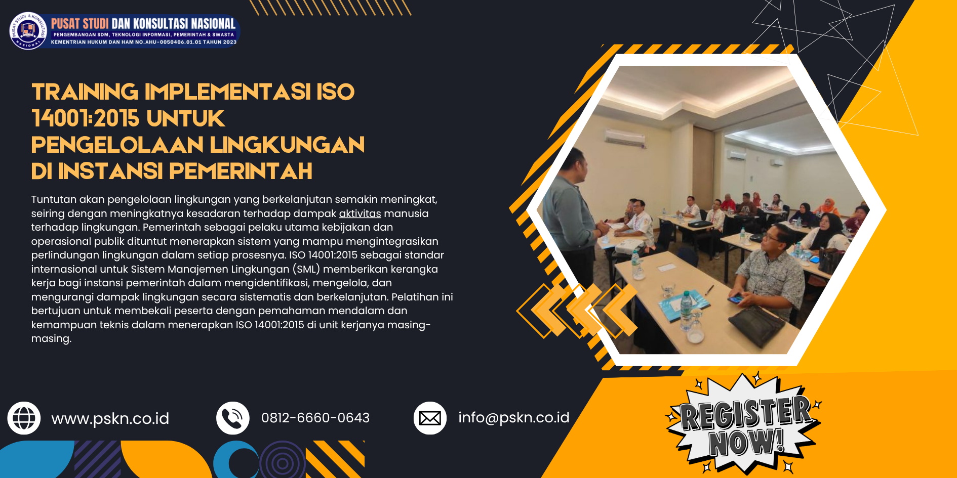 Dengan Ini Kami Pusat Studi Konsultasi Nasional Mengundangan Bapak/Ibu Untuk Hadir dalam Bimbingan Teknis Dengan Tema Training Implementasi ISO 14001:2015 untuk Pengelolaan Lingkungan di Instansi Pemerintah”