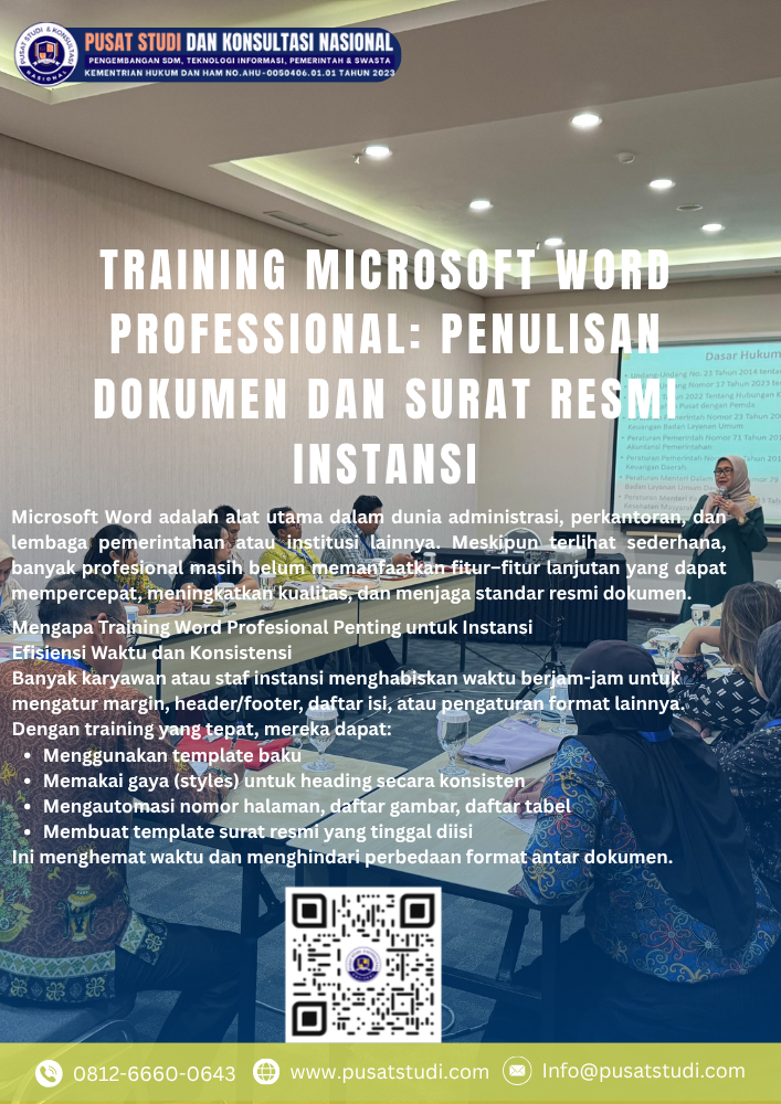 Training Microsoft Word Professional untuk Penulisan Dokumen dan Surat Resmi Instansi — kuasai teknik lanjutan dalam pembuatan dokumen formal (≤ 160 karakter)